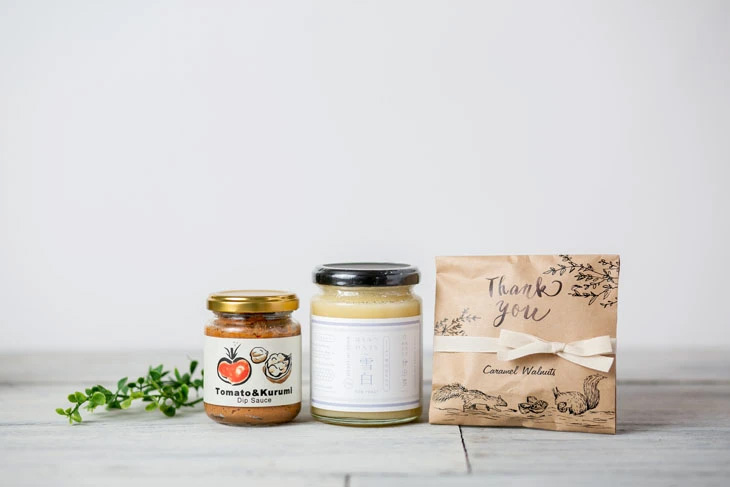 長野県の軽井沢の雑貨店より届いたキャラメルくるみのナッツがセットになっています。パッケージがとてもかわいらしく『Thank you』という文字が入っているので、感謝の気持ちが伝わります。