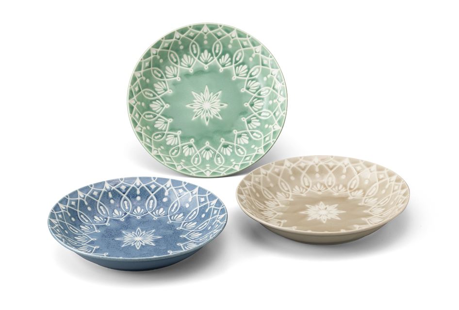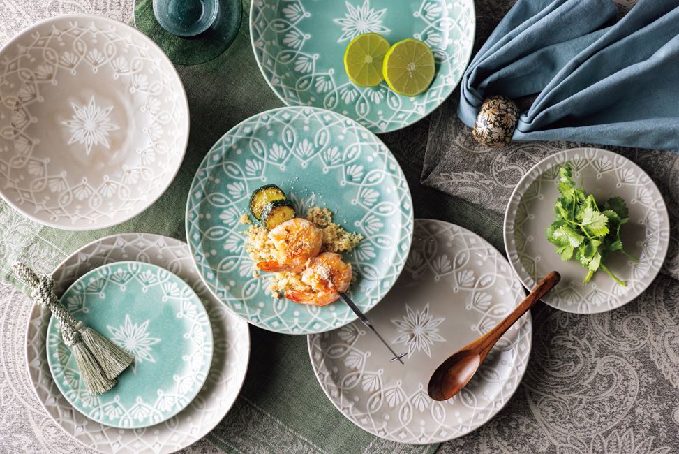 東洋のエキゾチックさに西洋のエッセンスを融合したことで盛り付けるお料理を選ばず、日本の食卓に取り入れやすいようデザインされました。盛り付けたお料理を額縁のように彩り、華やかに魅せる。日々の食事に星のような煌めきを添えるテーブルウエアです。