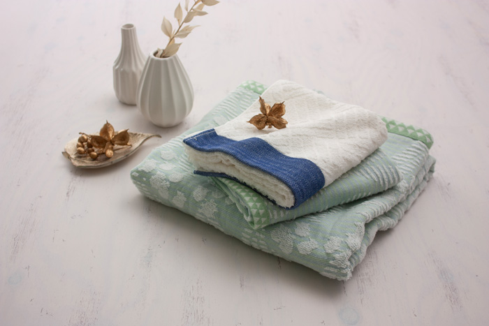 グリーンのタオルにはころんとした形がかわいらしい「すずらん」を、パープルのタオルには「さんかく模様」を織り上げました。