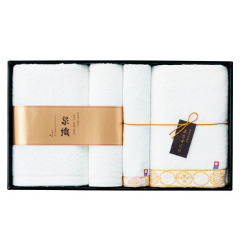 日本のタオルの2大名産地であるやわらかく吸水のよい甘撚り糸を使用した泉州タオルと心地良い純白の今治タオルをセットしたギフトです。