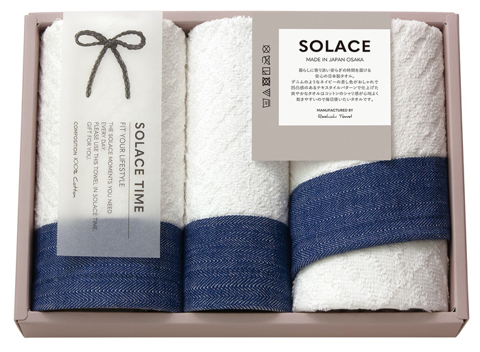 結婚式の引き出物に「SOLACE〈ソラス〉 日本製 タオルセット」はいかがでしょうか?デニムのようなネイビーの差し…